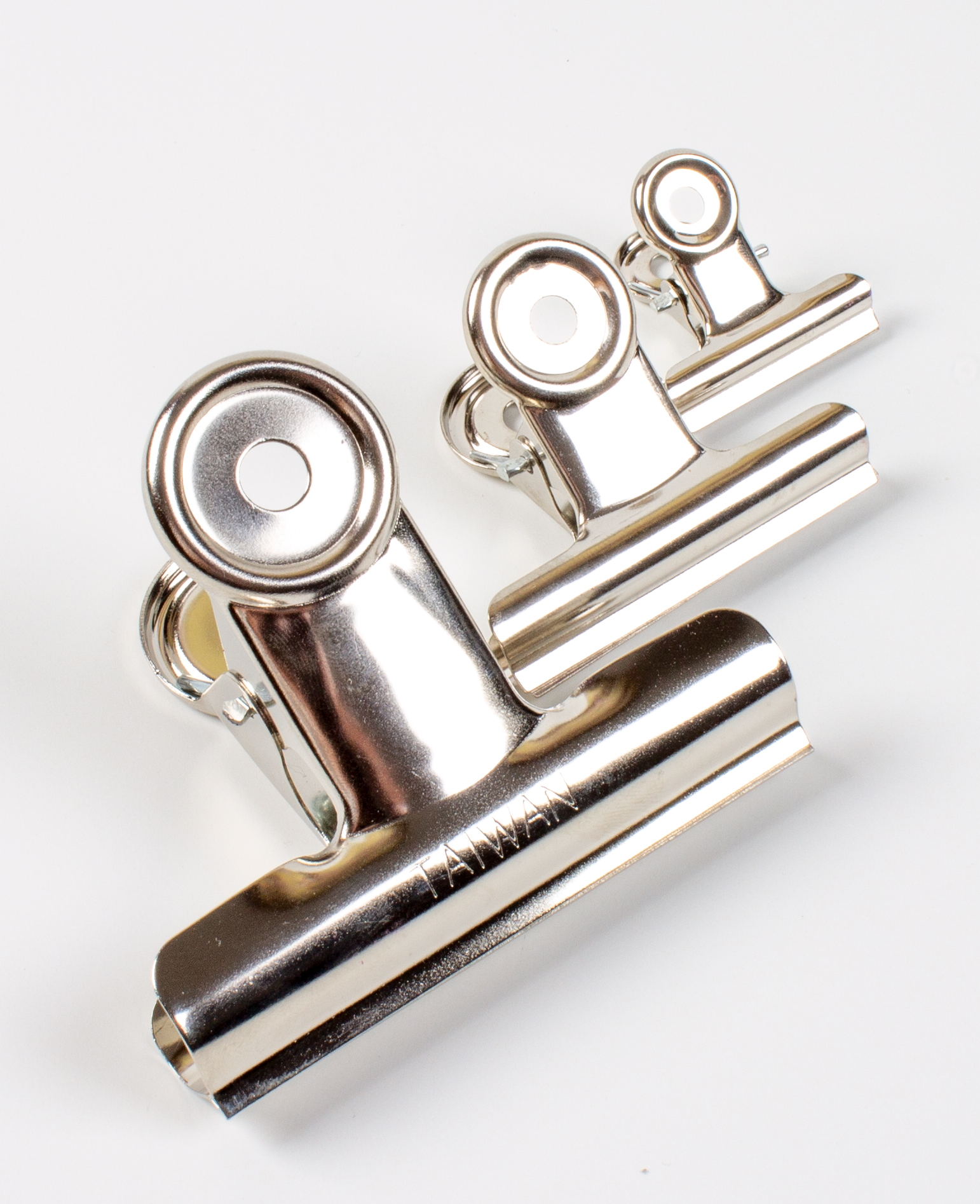 Klammer aus verchromten Stahl, zum Fixieren von Aquarellpapier und Karton auf festen Untergründen und zum Zusammenhalten von Papierstapeln oder Akten.