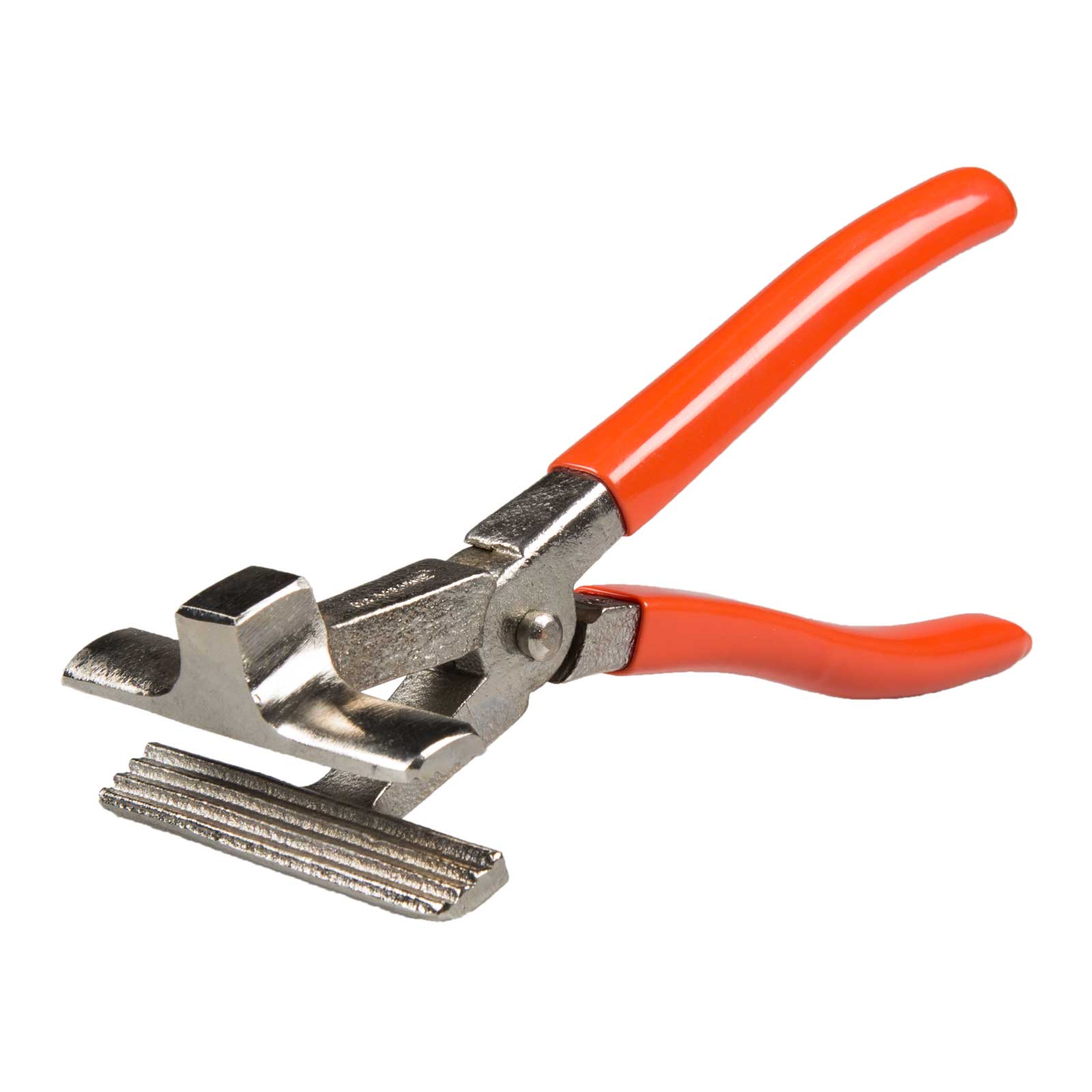 Eine solide Druckgussspannzange mit Gegendruck-, bzw. Hammerbolzen. Die Backen der Zange sind zirka 87 mm breit mit einer Backentiefe von 15 mm.