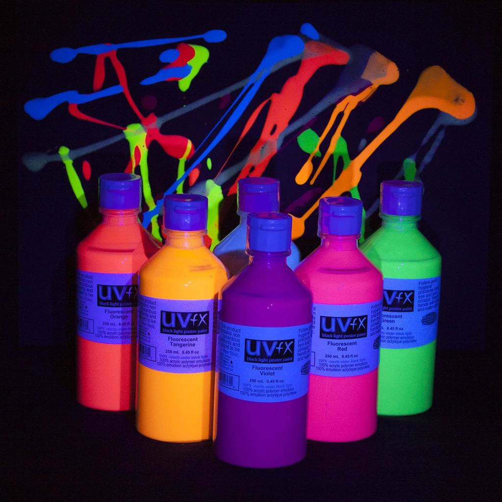 UVfx-Posterfarbe trocknet zu einem dauerhaften, geschmeidigen matten oder glänzenden Finish.Die Farben sind beim Auftragen hell und leuchten unter Schwarzlicht! Diese ungiftige, geruchsarme Farbe ist in zehn Farben erhältlich und besteht zu 100 % aus Acrylemulsion.