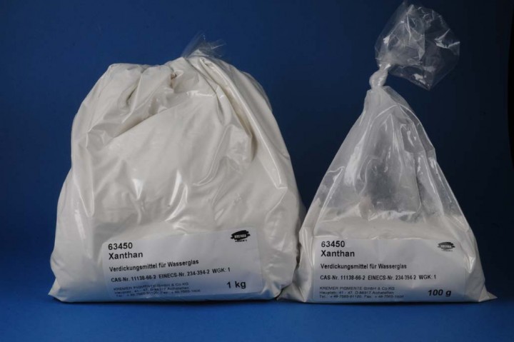 Xanthan wird mit Hilfe von Bakterien aus zuckerhaltigen Substraten gewonnen und dient als natürliches Verdickungs- und Gelmittel für wässrige Bindemittelgemische. Xanthan gilt als gesundheitlich unbedenklich (E 415). Anwendung 0,1 - 1 % bezogen auf das Bindemittel.