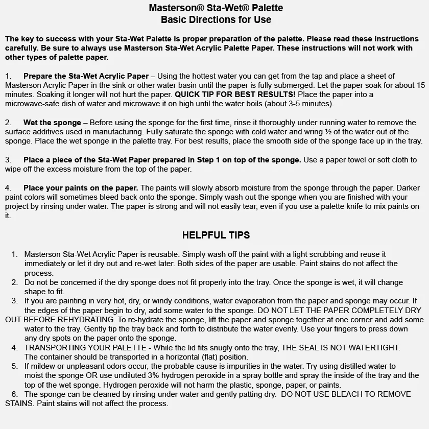 Das Sta-Wet-Palettensystem wurde vor über 20 Jahren von Masterson entwickelt und ist in seiner Funktionalität unübertroffen. Das Sta-Wet-Verfahren von Masterson hält Acrylfarben und andere Farben auf Wasserbasis auf der offenen Palette stundenlang feucht.