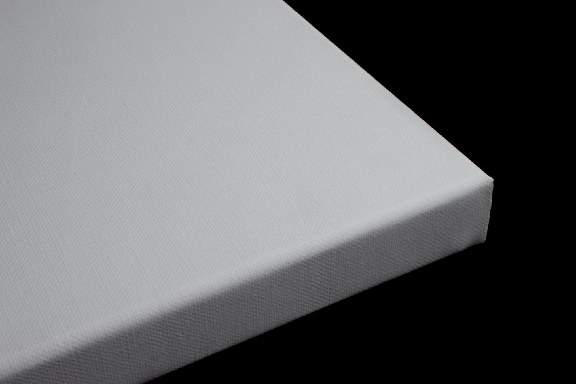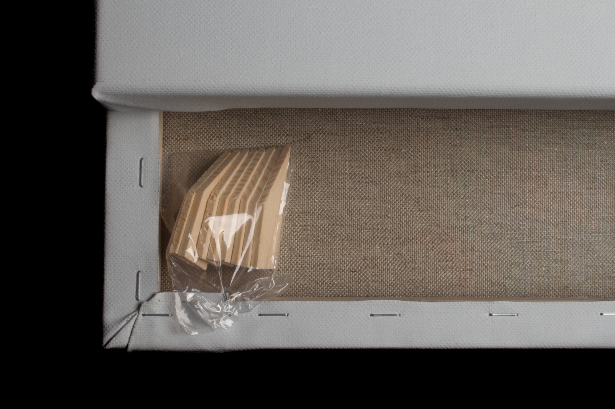 Der bespannte Keilrahmen hat ein Spezial-Profil (3.3 cm tief x 2.2 cm breit). Er besteht aus getrocknetem, nicht ganz abgeharztem Kiefernholz, das für die bleibende, gerade Form der Rahmen sorgt. Der verwendete Stoff ist ein hochwertiges Baumwollgewebe von 330g/m², grundiert mit Gesso (Universalgrundierung ) . Dank einer Färbung hat die Baumwolle auf der Rückseite eine Leinenoptik. Alle Leinwände sind hinten getackert und einzeln in Folie verpackt. Jeder Leinwand liegt ein Set Keile bei. Unsere Produktion findet teilweise in unserer Werkstatt in Berlin, aber auch in unserem Werk in Polen, statt.