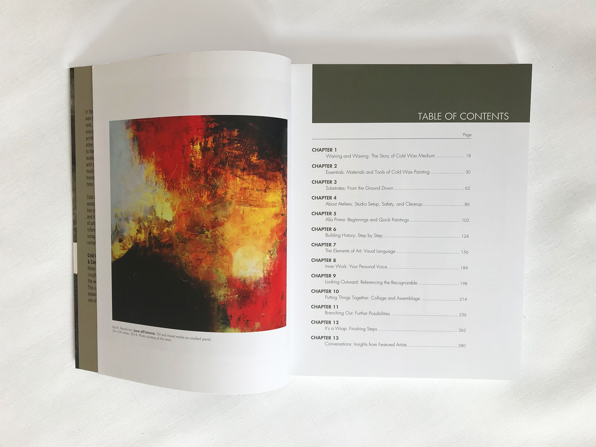 Full color photographs of artwork from more than 100 artists around the world, including abstract images, portraits, landscapes, still lifes, and work that combines cold wax with sculpture, collage, encaustic, printmaking, and other media.