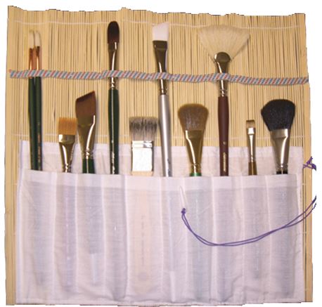 Store long and short handle items safely and securely. Silver Brush Ltd. featherweight mats feature sewn in soft cloth interior pockets, an elastic band at the top to hold long items securely in place and a tie for closure. Use for artist brushes, kneeting needles, crochet hooks and more. Roll it up and secure with the attached string the for a compact holder.