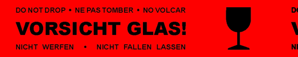 Rot-transparentes Klebeband mit Beschriftung "Vorsicht Glas" in verschiedenen Sprachen mit Untertitel "Nicht werfen - nicht fallen lassen"